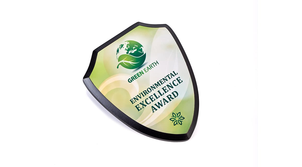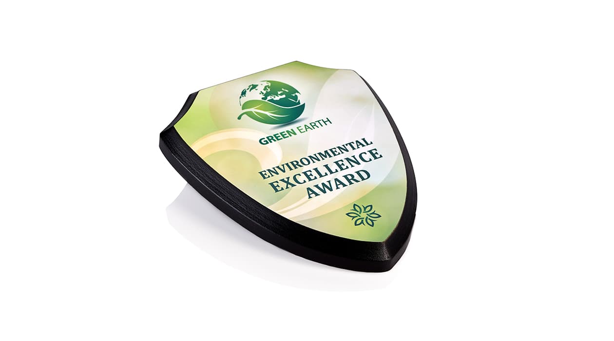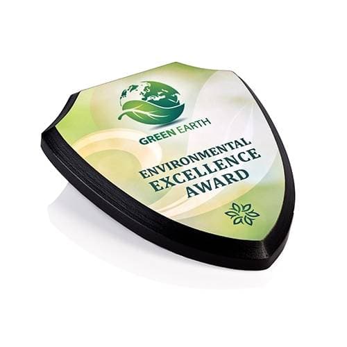 You can create Specialty Shaped Plaques at Dubaiprint.com that will fit your needs. The shield-shaped plaque will be 12.7 x 15.2 cm in total with 11.7 x 14.2 cm printing area.